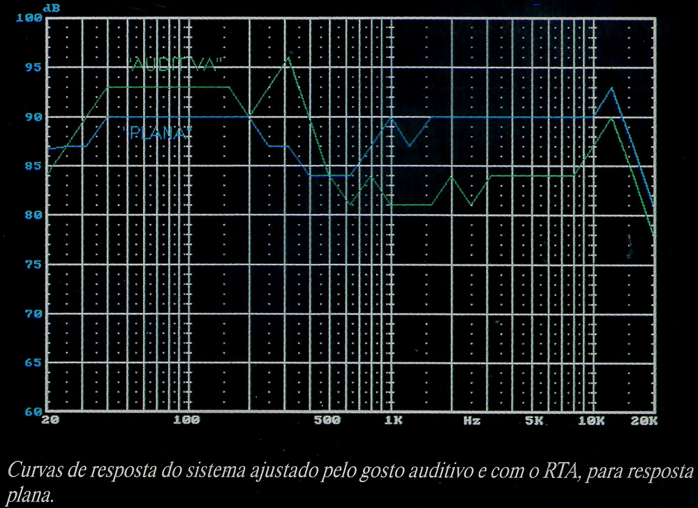 Na curva de resposta do sistema, ajustada pelo gosto auditivo, os graves aparecem com um reforço significativo em relação aos médios. Isto se deve menor sensibilidade do ouvido em baixas frequências (principalmente. corn baixo volume), em relação aos media Na curva ajustada para resposta plana, apenas os controles de nível do crossover foram utilizados pois o sistema d do tipo minimalista, ou seja, quanta menos equipamentos para degradar o sinal, melhor. Por este motivo, não existe equalizador e nem mesmo pré amplificador no sistema.
